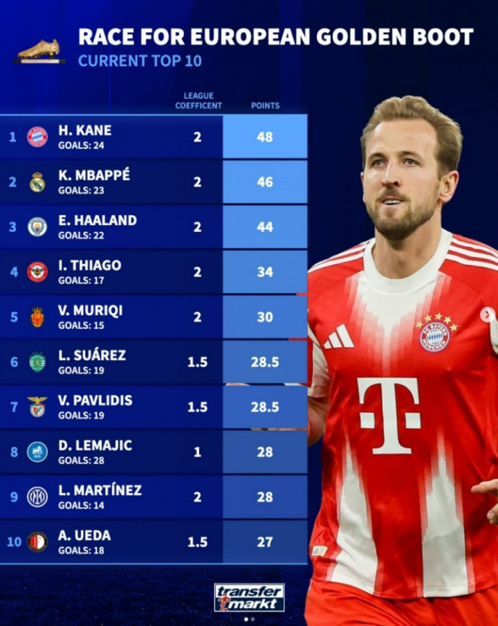 乐鱼体育官网 本赛季当今欧洲金靴奖积分榜: 凯恩居首, 姆巴佩次席、哈兰德第三